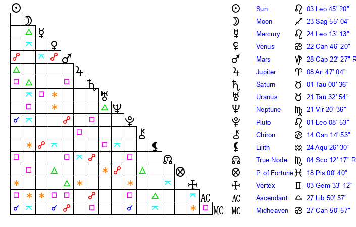 | Mercury | 24 Leo 12 | 12 Leo 6 | 15 Scorpio 41 |