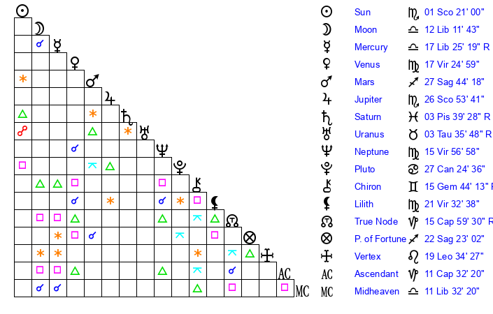 | Moon | 12 Libra 14 | 18 Sagittarius 11 | 24 Capricorn 37 |