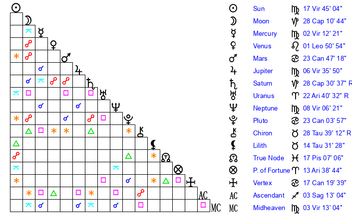 | Sun | 17 Virgo 45 | 18 Virgo 14 | 20 Sagittarius 29 |