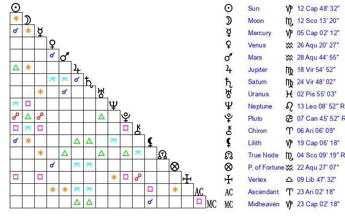 | Sun | 12 Capricorn 48 | 13 Capricorn 34 | 27 Aries 8 |