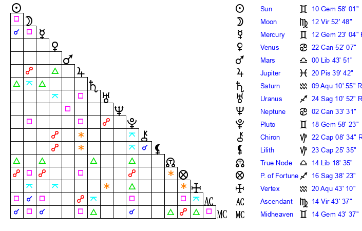 | Sun | 10 Gemini 58 | 12 Gemini 24 | 8 Libra 19 |