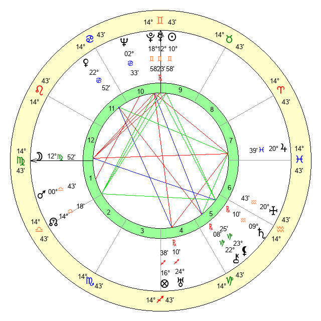 | Moon | 12 Virgo 58 | 7 Virgo 26 | 23 Aquarius 54 |