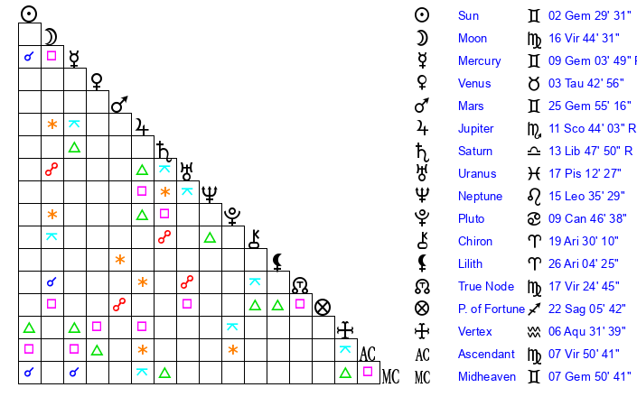 | Moon | 16 Virgo 49 | 29 Aries 41 | 12 Gemini 1 |