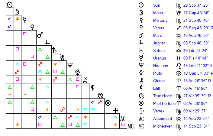 | Sun | 29 Scorpio 37 | 0 Sagittarius 39 | 14 Pisces 6 |