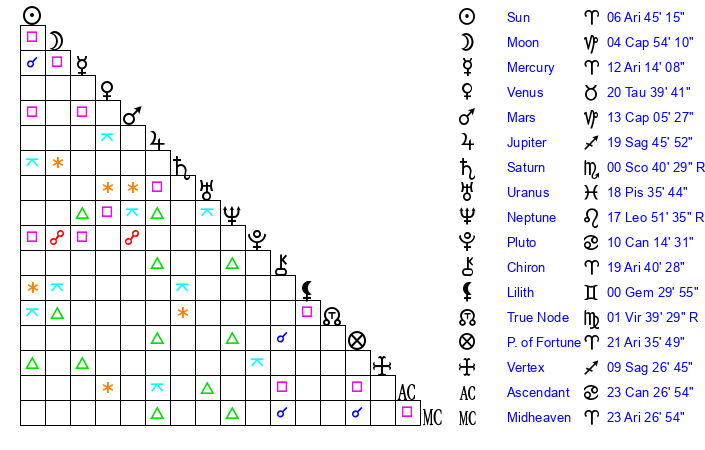 | Sun | 6 Aries 45 | 7 Aries 16 | 14 Cancer 18 |