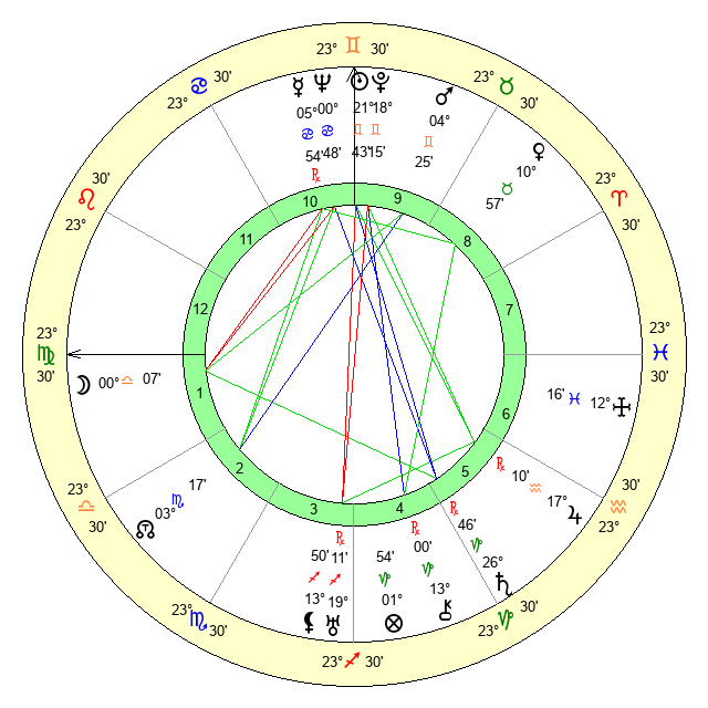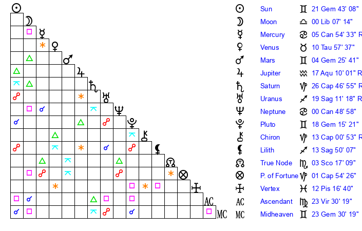 | Sun | 21 Gemini 43 | 22 Gemini 56 | 20 Libra 24 |