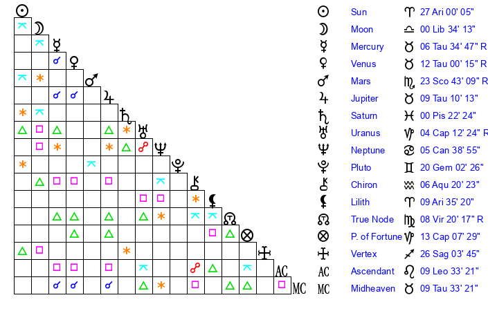 | Sun | 27 Aries 0 | 27 Aries 56 | 22 Leo 10 |