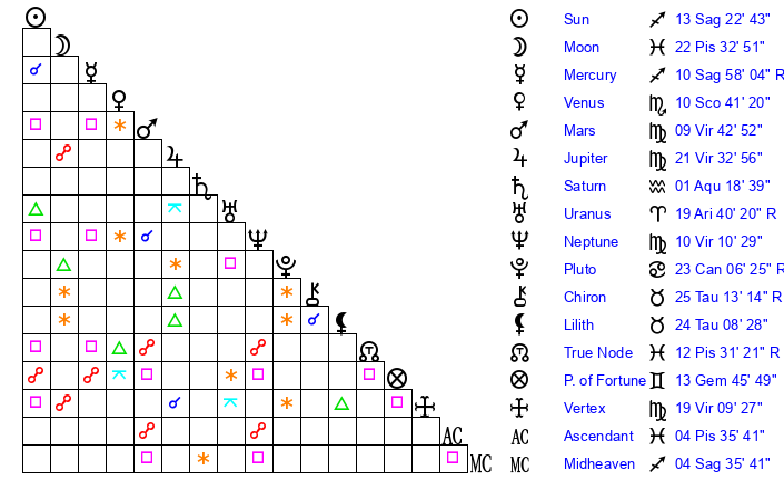 | Neptune | 10 Virgo 10 | 29 Pisces 22 | 8 Virgo 33 |