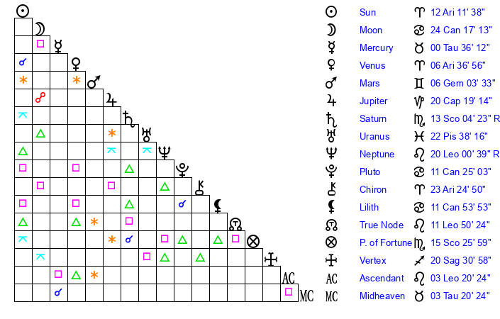 | Sun | 12 Aries 11 | 12 Aries 57 | 18 Cancer 36 |