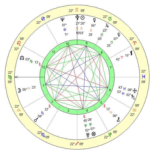 | Sun | 20 Gemini 4 | 21 Gemini 1 | 15 Libra 44 |