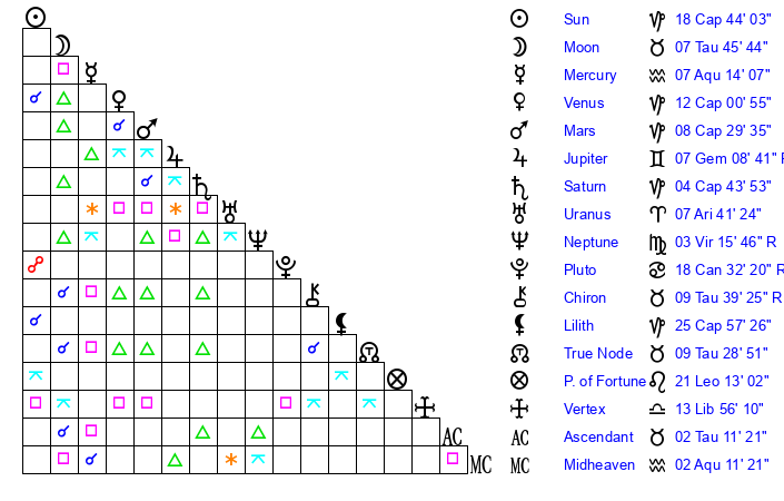 | Venus | 12 Capricorn 1 | 6 Pisces 51 | 10 Taurus 36 |