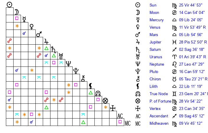 | Moon | 14 Cancer 51 | 2 Virgo 17 | 3 Aquarius 54 |