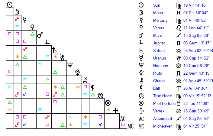 | Sun | 19 Virgo 14 | 20 Virgo 11 | 19 Capricorn 34 |