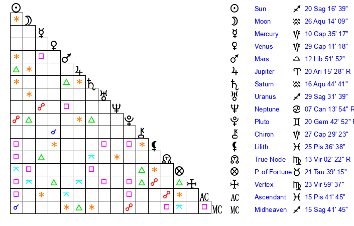 | Pluto | 20 Gemini 43 | 2 Aquarius 10 | 19 Gemini 59 |