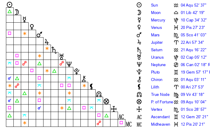 | Moon | 1 Libra 20 | 16 Sagittarius 0 | 26 Aquarius 32 |