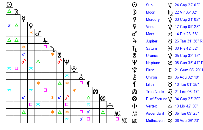 | Venus | 17 Capricorn 10 | 12 Pisces 34 | 15 Gemini 1 |
