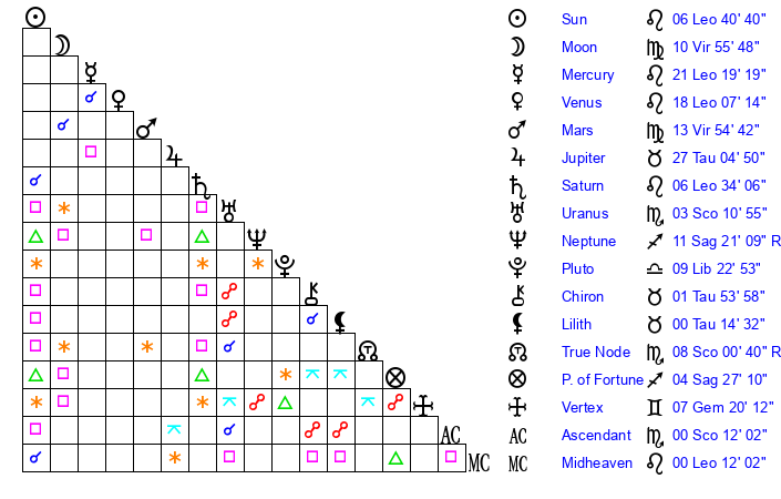 Venus | 18 Leo 7 | 28 Gemini 19 | 18 Libra 23 |