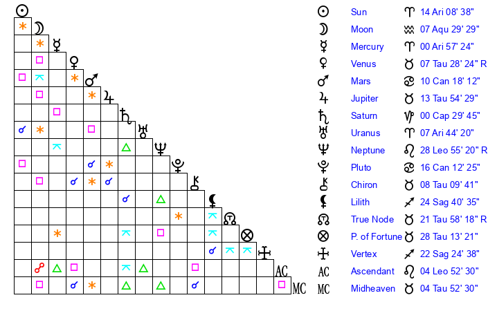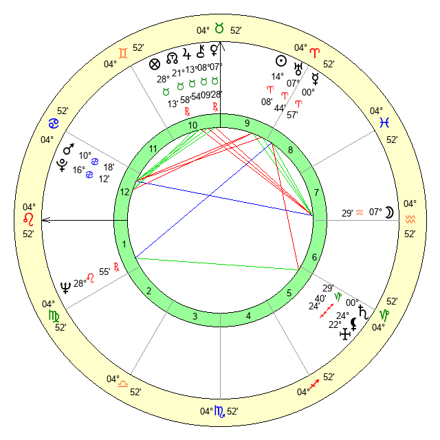 | Neptune | 28 Leo 55 | 0 Aries 11 | 29 Leo 32 |