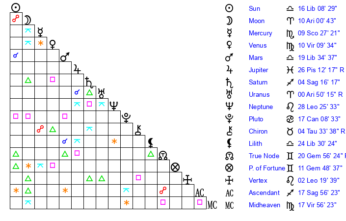 | Sun | 16 Libra 9 | 17 Libra 24 | 25 Capricorn 5 |