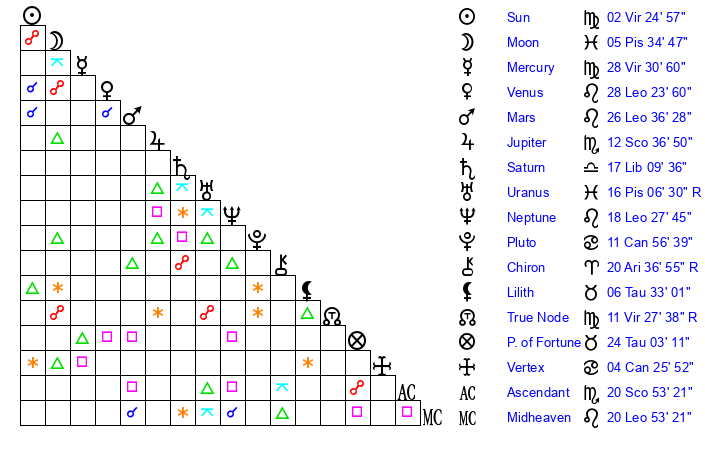 | Mercury | 28 Virgo 31 | 17 Leo 42 | 24 Sagittarius 55 |