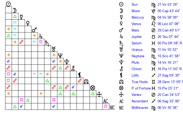 | Mercury | 4 Virgo 58 | 23 Virgo 15 | 9 Sagittarius 12 |