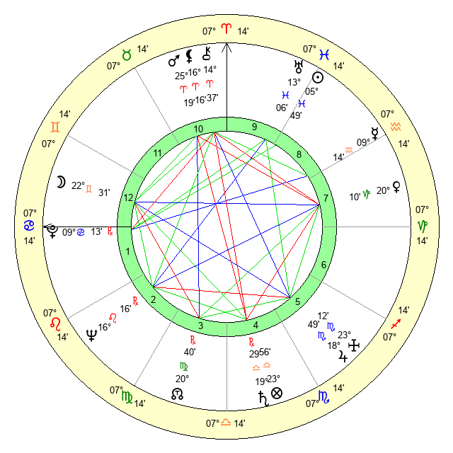 | Mars | 25 Aries 19 | 17 Cancer 2 | 4 Cancer 58 |