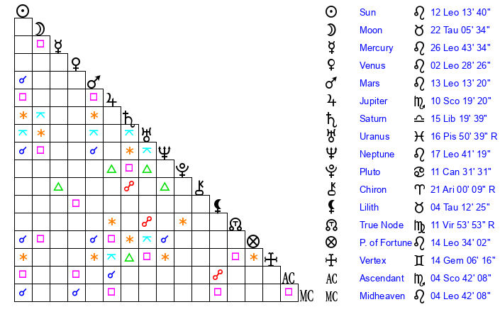 | Neptune | 17 Leo 41 | 1 Aries 54 | 20 Leo 22 |