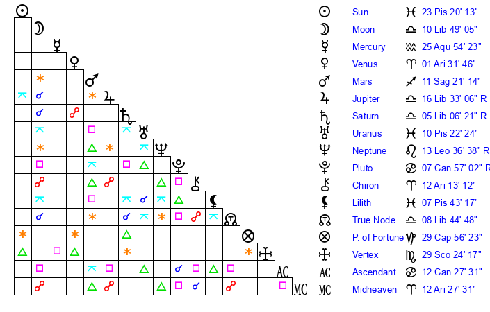 | Sun | 23 Pisces 20 | 24 Pisces 22 | 3 Cancer 19 |