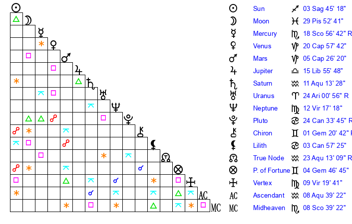 | Mercury | 18 Scorpio 56 | 21 Scorpio 42 | 20 Pisces 13 |
