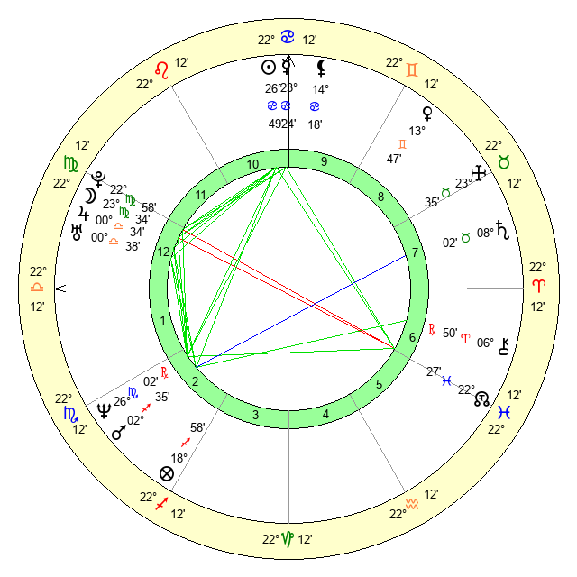 | Moon | 23 Virgo 36 | 19 Taurus 31 | 12 Libra 56 |