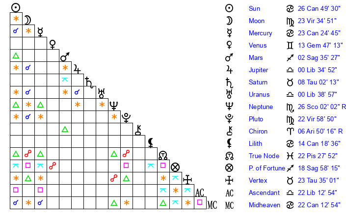 | Moon | 23 Virgo 36 | 19 Taurus 31 | 12 Libra 56 |