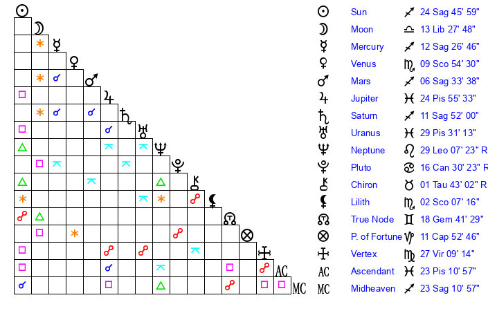 | Sun | 24 Sagittarius 46 | 26 Sagittarius 15 | 2 Aries 49 |