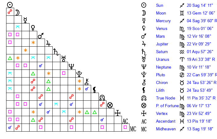 Jupiter | 21 Virgo 54 | 15 Gemini 37 | 17 Virgo 21 |