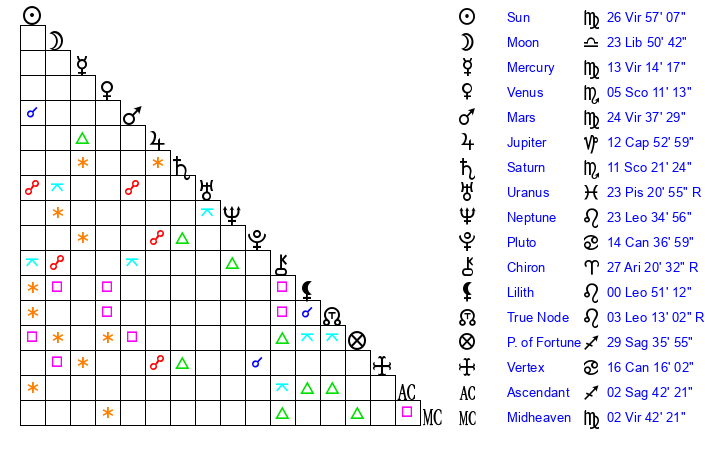 | Moon | 23 Libra 56 | 11 Virgo 49 | 0 Cancer 12 |