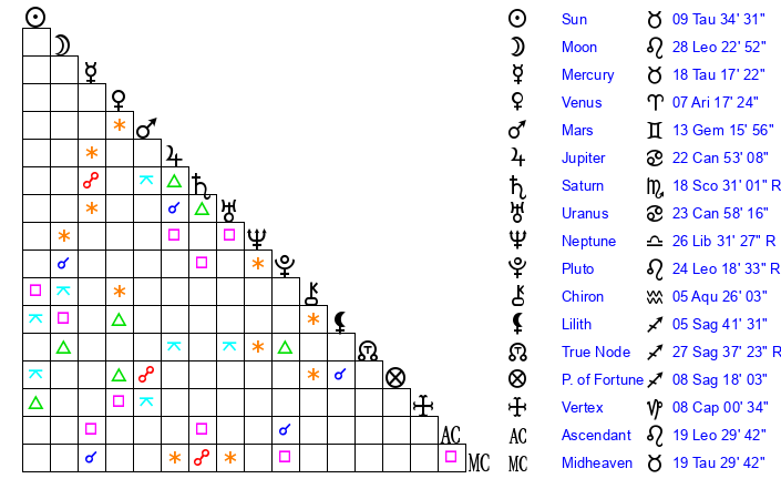 | Moon | 28 Leo 26 | 21 Gemini 21 | 7 Pisces 52 |