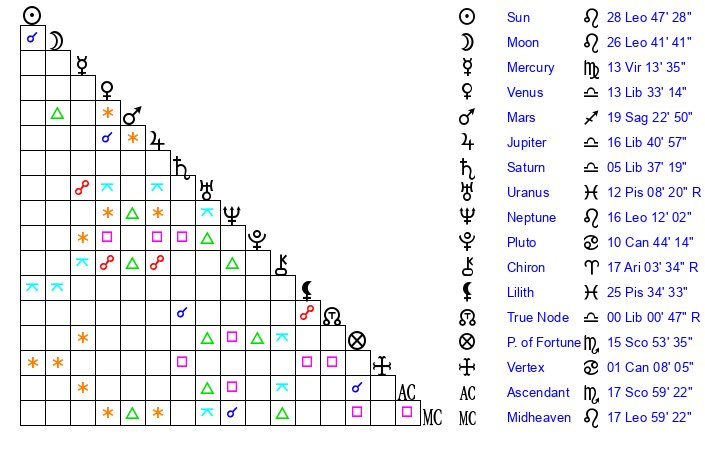 | Sun | 28 Leo 47 | 29 Leo 51 | 10 Sagittarius 46 |