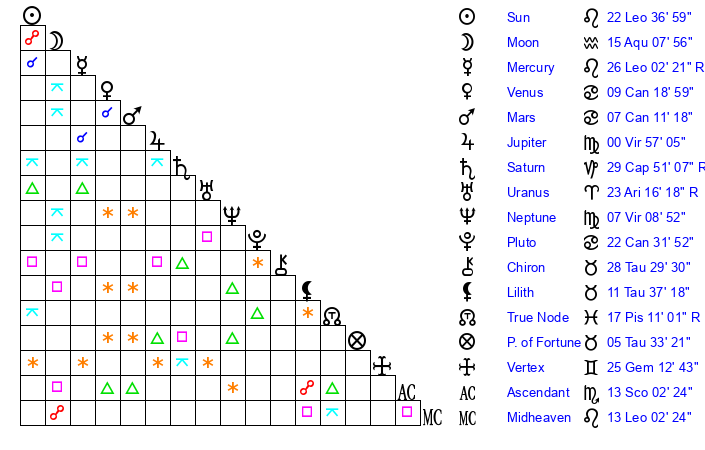 | Moon | 15 Aquarius 0 | 16 Taurus 15 | 1 Cancer 17 |