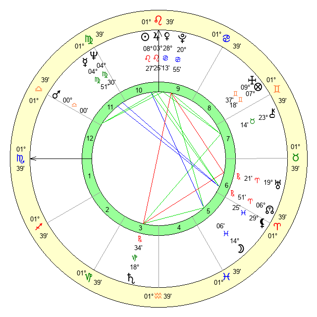 | Moon | 14 Pisces 5 | 11 Scorpio 41 | 15 Leo 23 |