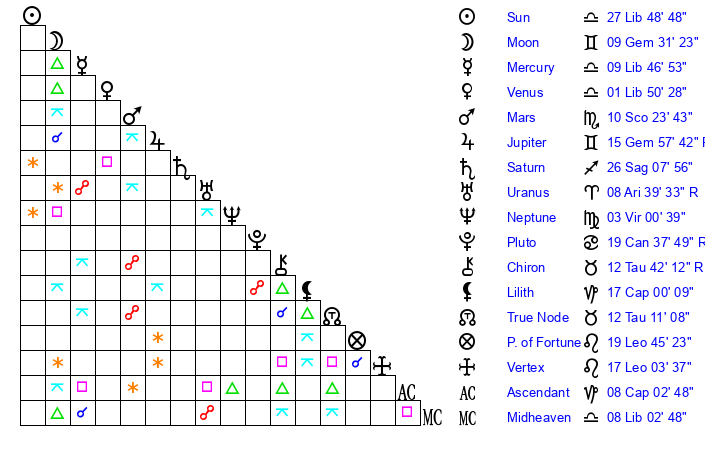 | Mercury | 9 Libra 47 | 21 Scorpio 1 | 26 Capricorn 45 |