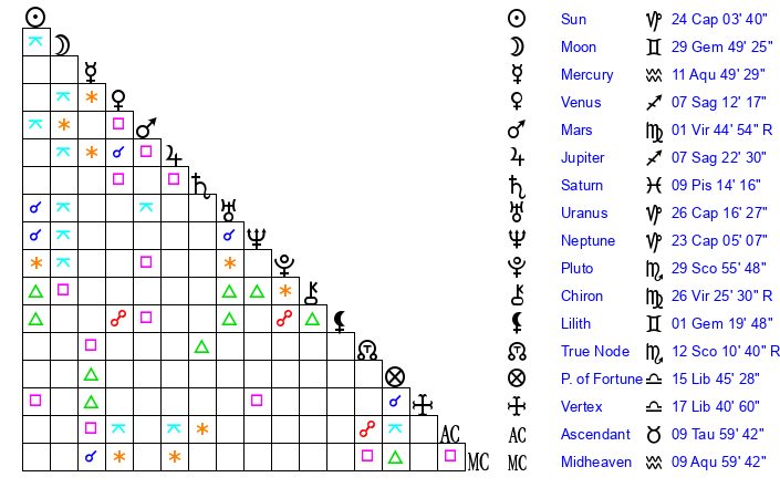 | Neptune | 23 Capricorn 5 | 27 Pisces 32 | 24 Capricorn 11 |