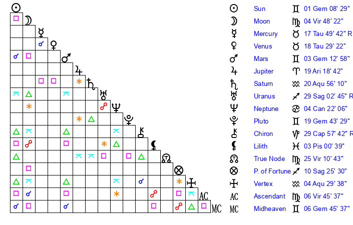 | Sun | 1 Gemini 8 | 1 Gemini 51 | 27 Virgo 17 |