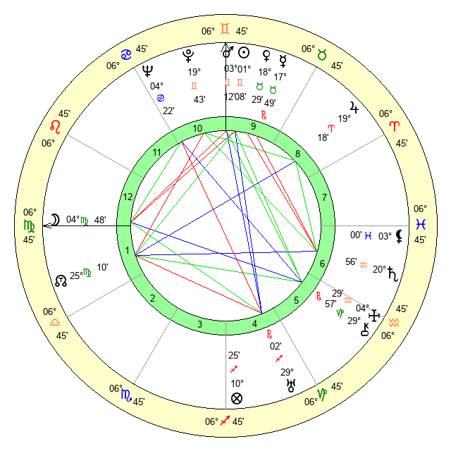 | Moon | 4 Virgo 54 | 0 Aries 20 | 13 Aquarius 36 |