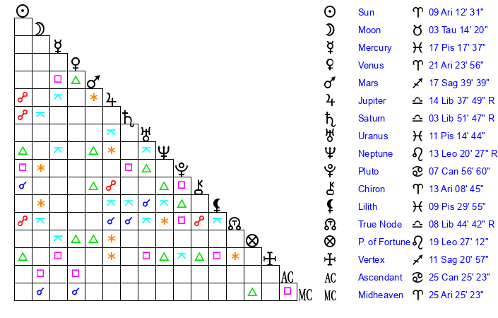 | Moon | 3 Taurus 19 | 27 Aries 55 | 18 Aquarius 14 |