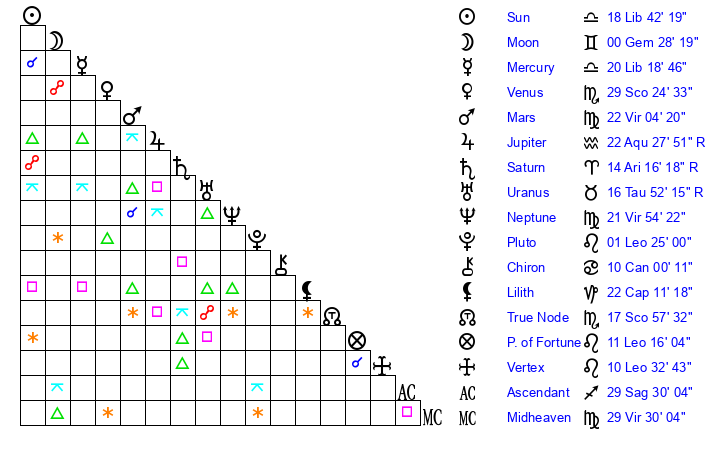 | Sun | 18 Libra 42 | 19 Libra 37 | 16 Capricorn 30 |