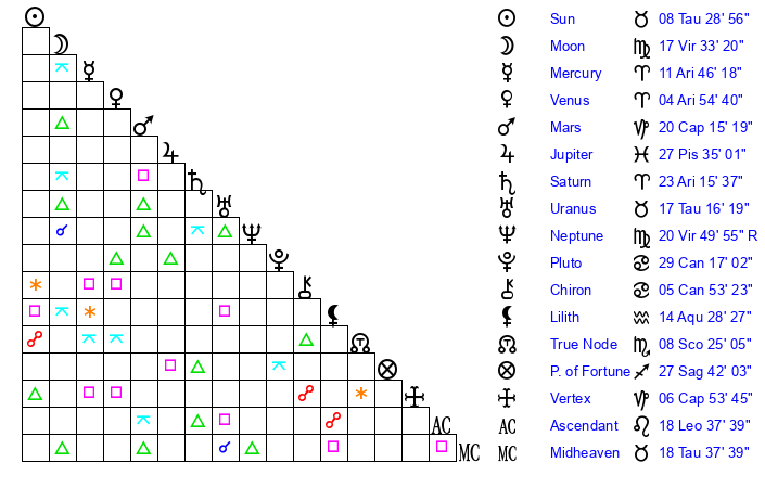 | Moon | 17 Virgo 39 | 6 Gemini 33 | 16 Scorpio 1 |