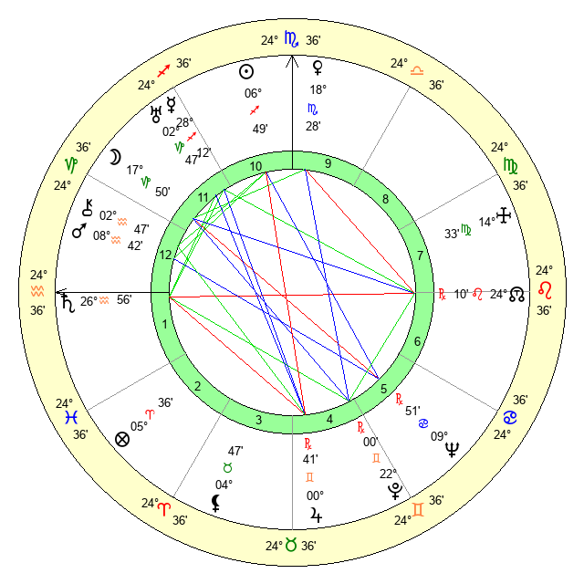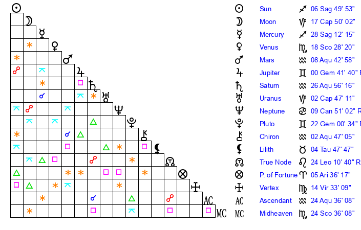 | Saturn | 27 Aquarius 23 | 25 Pisces 4 | 9 Pisces 44 |