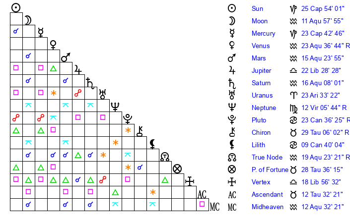 | Moon | 11 Aquarius 54 | 0 Virgo 4 | 11 Gemini 2 |