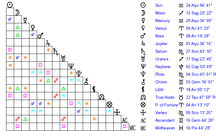 | Sun | 24 Aquarius 57 | 25 Aquarius 15 | 4 Aries 59 |