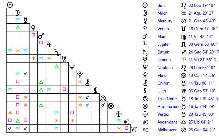 | Mercury | 21 Cancer 46 | 14 Leo 21 | 16 Libra 15 |