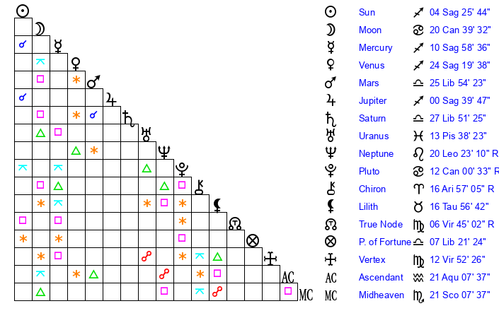 | Moon | 20 Cancer 41 | 28 Aquarius 44 | 23 Aries 2 |